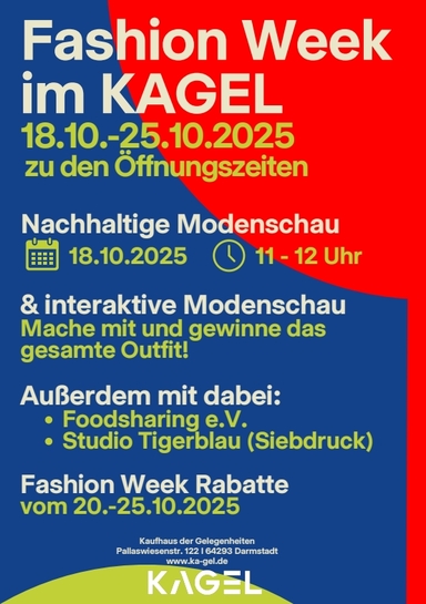 Das Kaufhaus der Gelegenheiten (KAGEL) veranstaltet am Samstag, 18. Oktober, von 11 bis 12 Uhr erstmals eine nachhaltige Modenschau. In der darauffolgenden Woche (20. bis 25. Oktober) wird es im Rahmen der KAGEL-Fashion-Week Rabatte auf Kleidung sowie Schuhe geben.