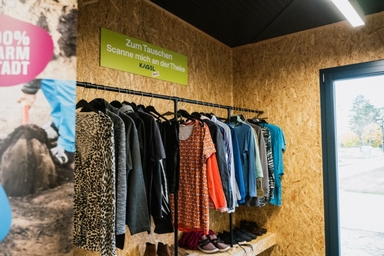 Second-Hand-Kaufhaus zur CO2-Reduktion und Ressourcenschonung: Ziel des Sharing-Angebots „KAGEL 24/7“, das im Teilprojekt „Urbane Sharing Modelle“ des Bundesforschungsprojekts DELTA entwickelt wurde, ist die Erforschung der Potentiale zur CO2-Reduktion durch das Weiterverwenden von Alltagsgegenständen und dem damit verbundenen Tauschhandel sowie durch die Synergieeffekte in Kombination mit weiteren Sharing-Angeboten am Hub. Für das „KAGEL 24/7“ haben die Betreiber:innen aus den Beständen bereits ein vielfältiges Sortiment an Alltagsgegenständen eingestellt, das am Eröffnungstag von den Gästen mit weiteren Gegenständen – analog vor Ort und digital in der „Darmstadt im Herzen“-App – ergänzt wurde.