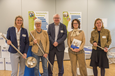 Im Bild (v.l.): Anna-Lena Schubert, Abteilungsleitung EAD, Dr. Ulrike Kreinhoff, Deutsche Gesellschaft für Ernährung e. V. (DGE) Sektion Hessen, Anré Schellenberg, Stadtkämmerer, Anja Erhart, Forschungsinstitut für biologischen Landbau (FiBL), Sabine Kleindiek, 1. Betriebsleitung, EAD. Bildrechte: C.Rau