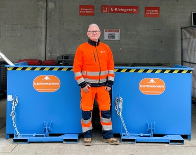 Nun bin ich seit vier Jahren auf dem Recyclinghof tätig. Es ist eine sehr abwechslungsreiche Tätigkeit. Ich habe sehr viel Kundenkontakt, arbeite mit dem Stapler und auch im Lager. Dort werden die Behälter gewaschen und bereitgestellt.